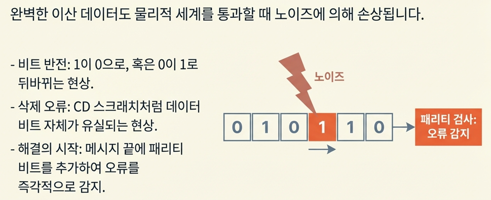 이산화된 데이터도 전송 과정에서 손상된다. 우주에서 날아드는 고에너지 입자 하나가 비트를 반전시키고, CD 표면의 작은 흠집이 수십 개의 비트를 한꺼번에 지운다.