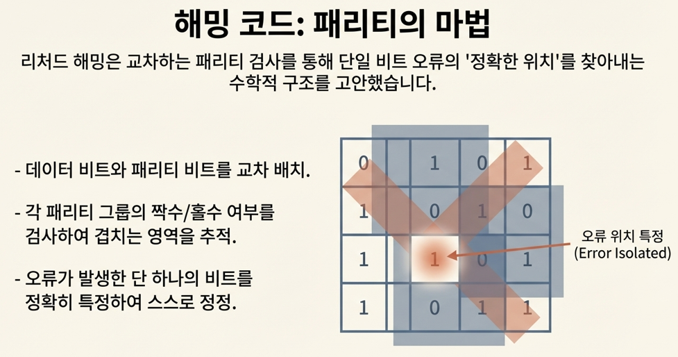 1947년, 벨 연구소의 리처드 해밍은 주말마다 컴퓨터 오류를 손으로 수정하는 일에 지쳐 있었다. 그는 오류가 어디서 났는지를 수학이 스스로 찾아낼 수 없을까라는 질문을 붙들었다. 패리티 검사를 교차 배치하여 단일 비트 오류의 정확한 좌표를 자동으로 찾아내고 정정하는 구조가 그 답이었다. 오류가 발생하면 어느 패리티 그룹들의 검사가 실패했는지 확인하고, 그 그룹들이 교차하는 단 하나의 비트가 오류 위치임을 수학이 스스로 지목한다.