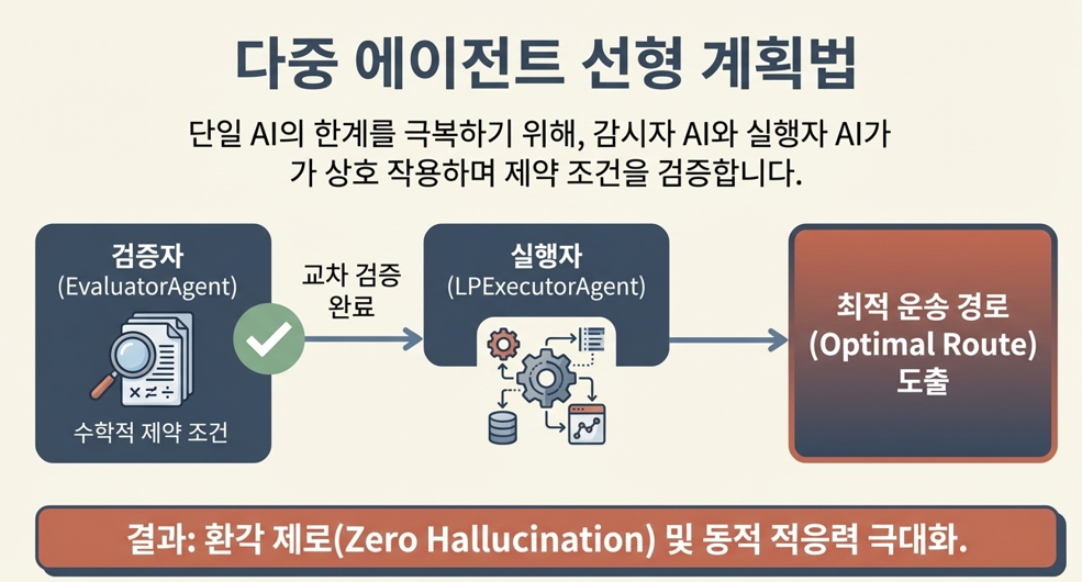 단일 AI의 한계를 넘기 위해 두 AI가 서로를 검증하는 구조도 등장했다. 하나는 선형 계획법 솔버를 돌려 최적 해를 계산하고, 다른 하나는 그 해가 모든 제약 조건을 만족하는지 검토한다. 회계사가 계산하고 감사자가 검토하는 것처럼, 수학적 엄밀성을 구조 자체에 심어놓은 것이다.